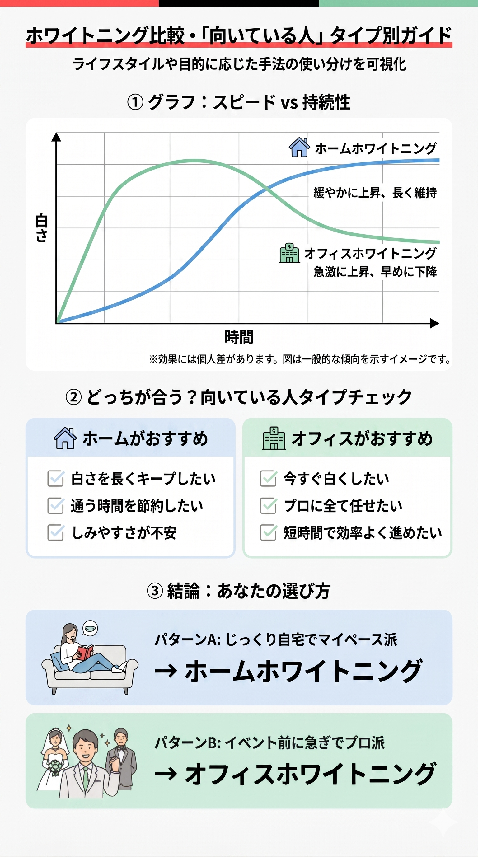 ※持続期間は一般的なオフィス/ホームホワイトニングの目安を記載しています。効果や持続期間には個人差があり、口にする飲食物によっても異なります。結婚式や撮影などイベント前の集中ケアにはオフィスホワイトニング、維持・定着を重視する場合はホームホワイトニングがおすすめです。