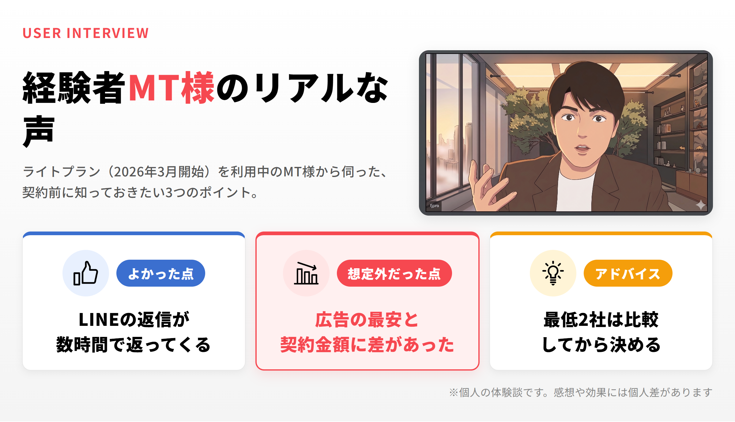 一方でMT様が想定外に感じたのは、広告で見た最安プランの金額と実際の契約金額のギャップです。