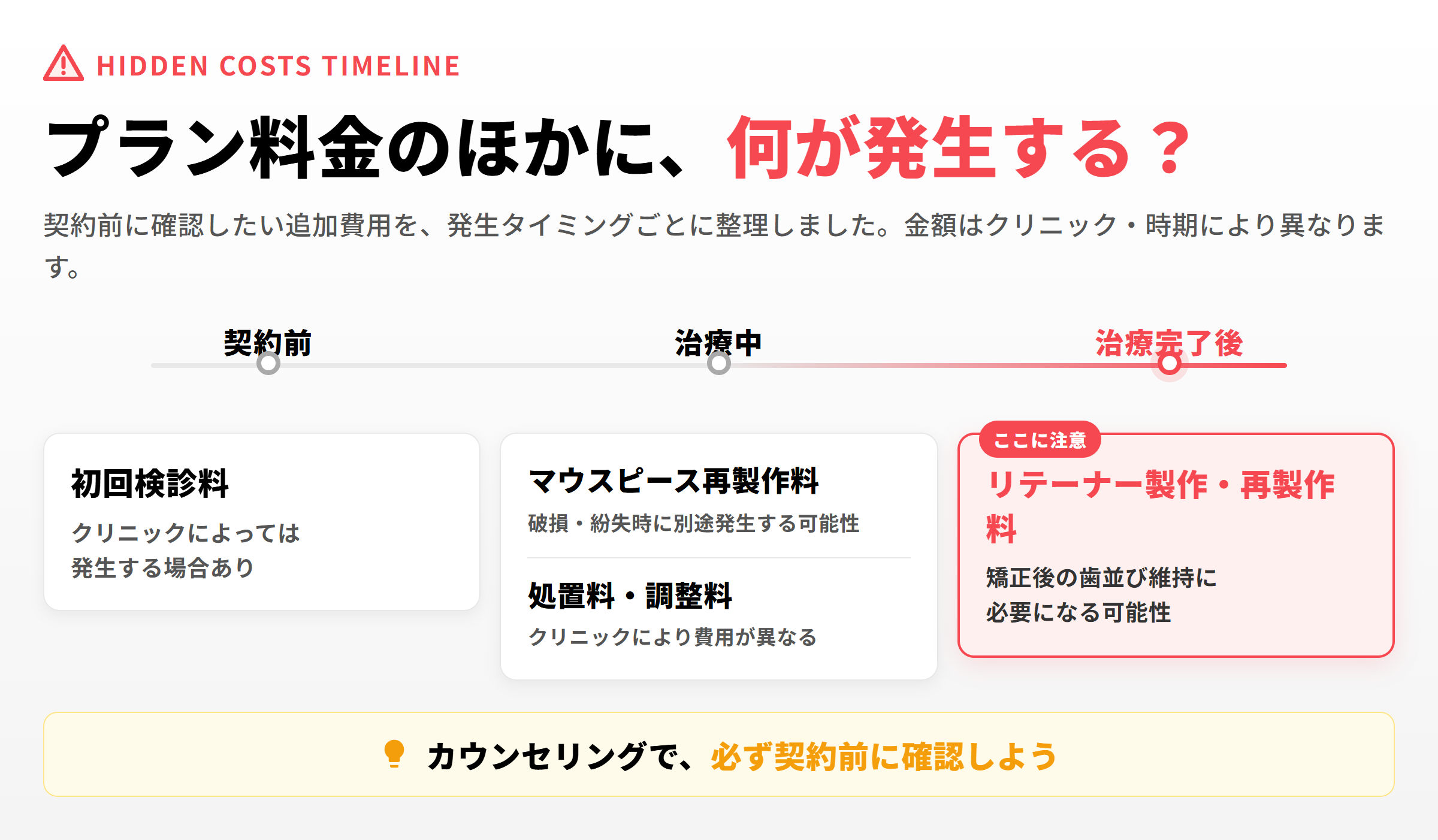 リテーナー・再製作料などプラン金額以外の費用を契約前に確認しておくと、総額の見通しが立ちます。医療費控除の活用も検討できるため、最新情報をあわせて確認しましょう。
