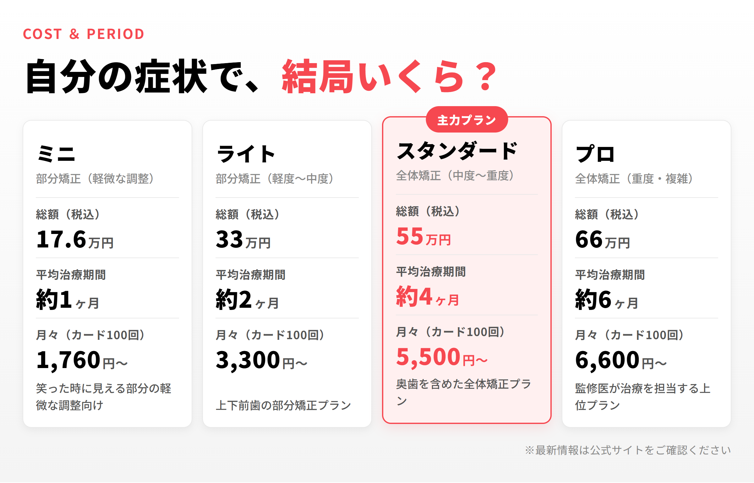 スタンダードプランは、奥歯を含めた全体矯正プランで、公式で「もっとも選ばれている」と案内される主力プランです。
