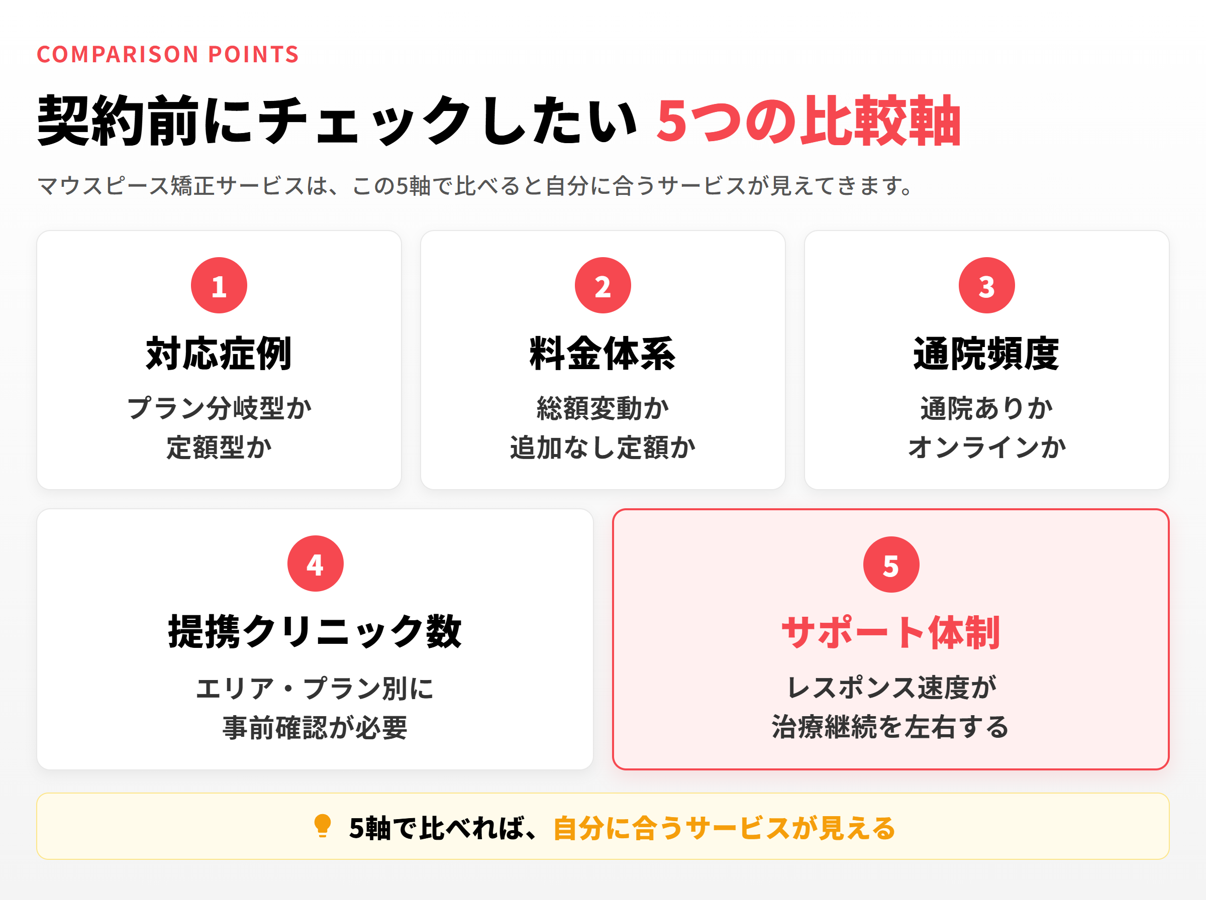 そこでここでは、マウスピース矯正サービス選びで注目したい5つの比較ポイントについて紹介します。