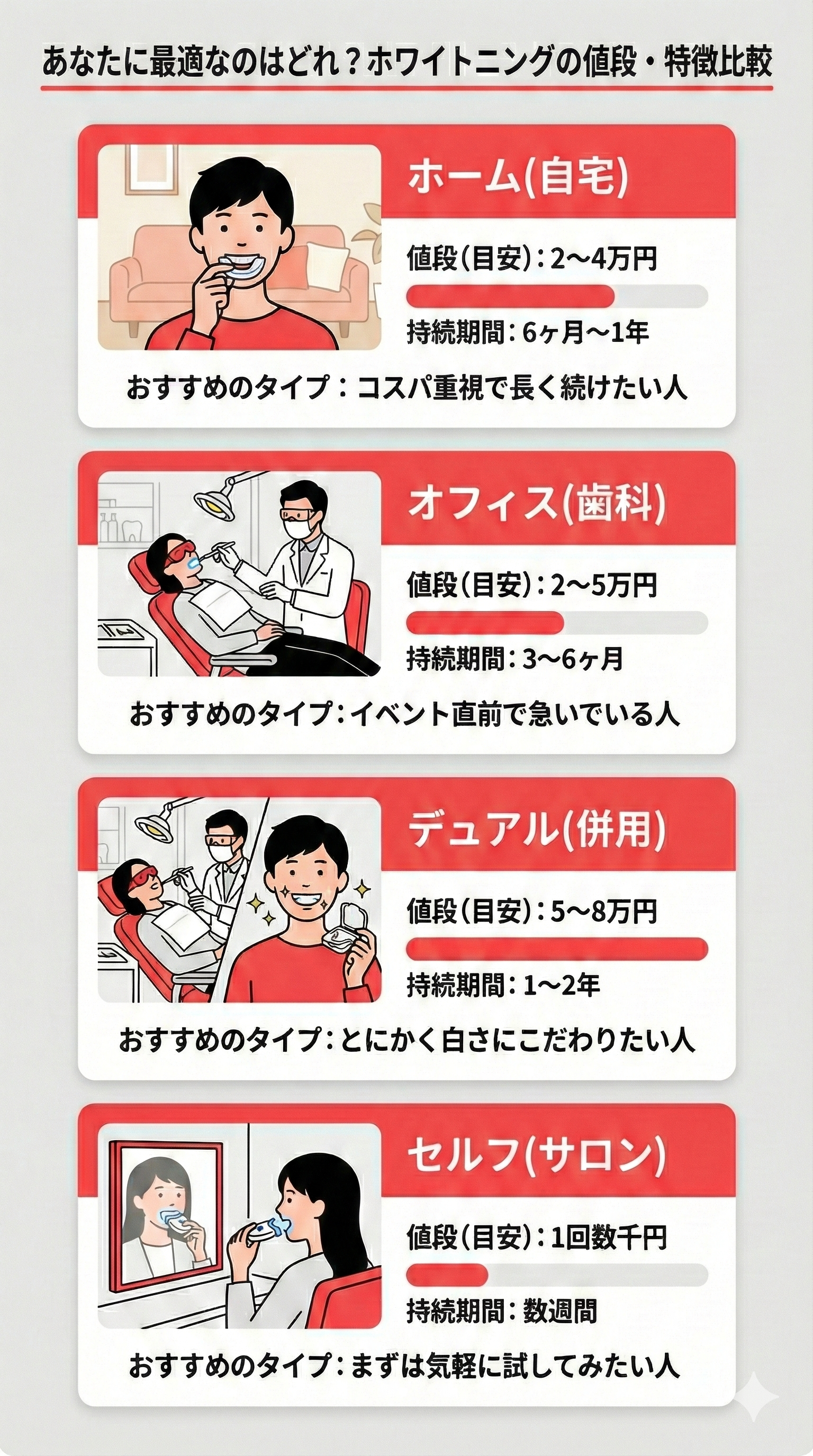 ※値段、持続期間は一般的なホワイトニングの目安を記載しています。効果や持続期間には個人差があり、口にする飲食物によっても異なります。結婚式や撮影などイベント前の集中ケアにはオフィスホワイトニング、維持・定着を重視する場合はホームホワイトニングがおすすめです。