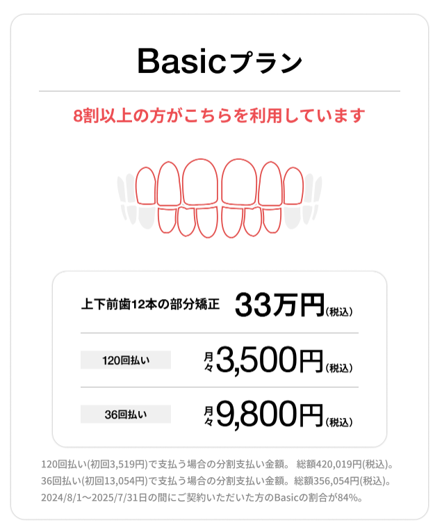 ※2020/1〜2023/7 Basicプランの実績値(保定期間除く)。上下前歯の部分矯正プランを120回払い(初回3,519円)で支払う場合の分割支払い金額。総額420,019円(税込)。