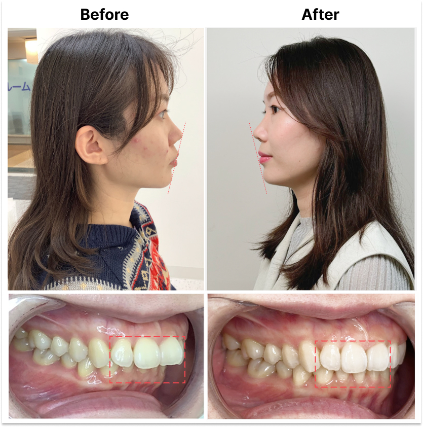 こちらの症例は、前歯が前方に傾いていたことが原因で、口元が突出して見えていたケースです。マウスピース矯正で歯の角度を適切な位置に整えた結果、短期間で横顔のバランスが美しく改善しました。