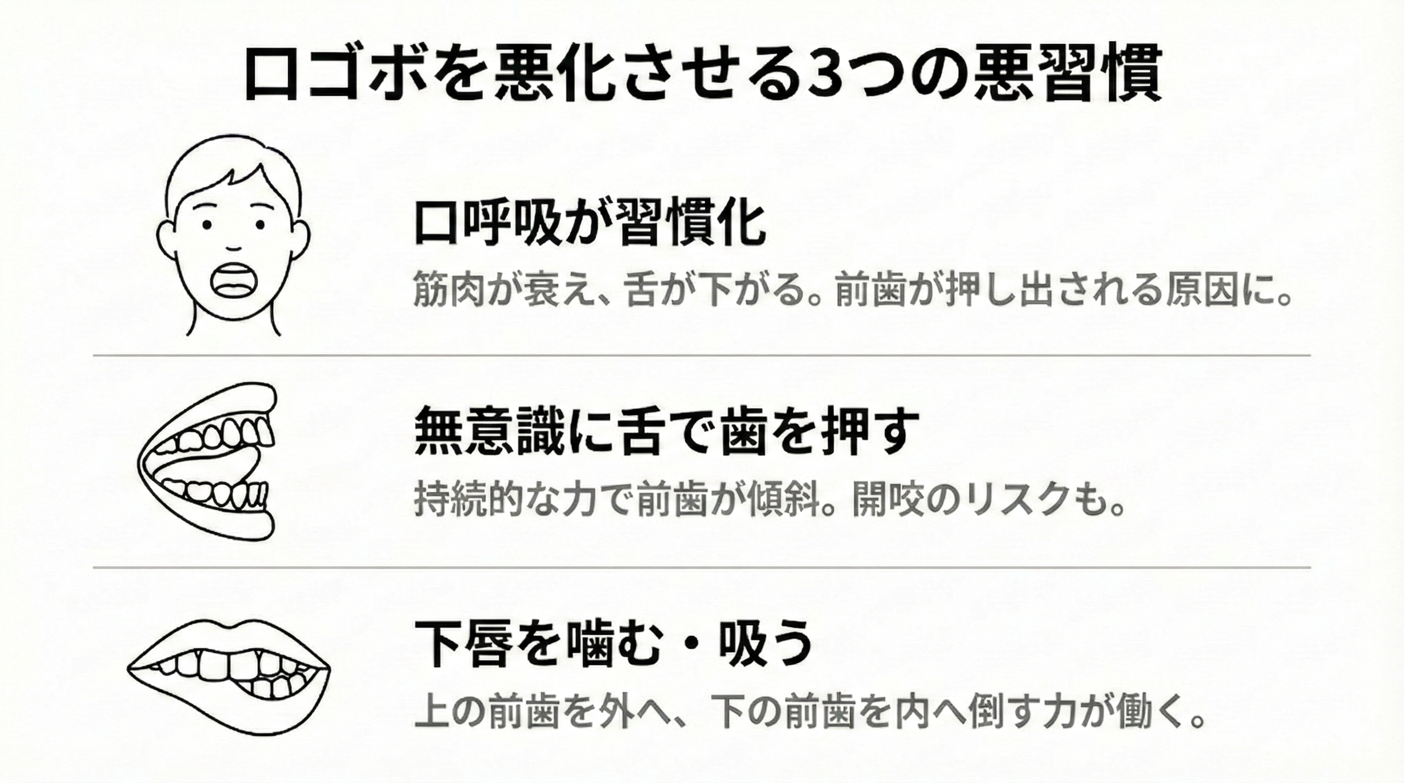 特に口周りの筋肉や舌の動きは歯並びに大きな影響を与えるため、以下の習慣に心当たりがある方は注意が必要です。