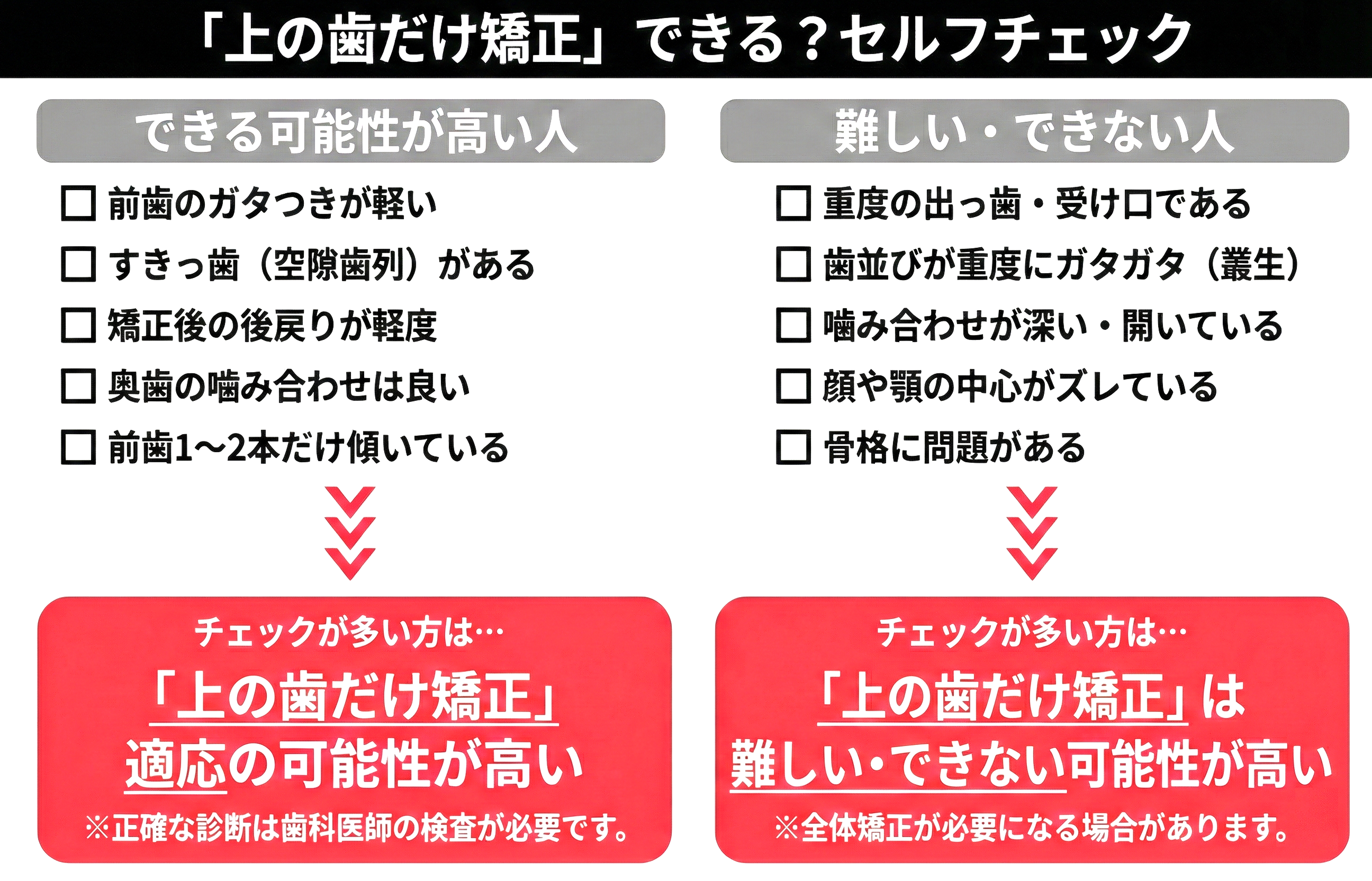 「上の歯だけを矯正して、費用や期間を抑えたい」と考える方は多いですが、すべての人に適応できるわけではありません。